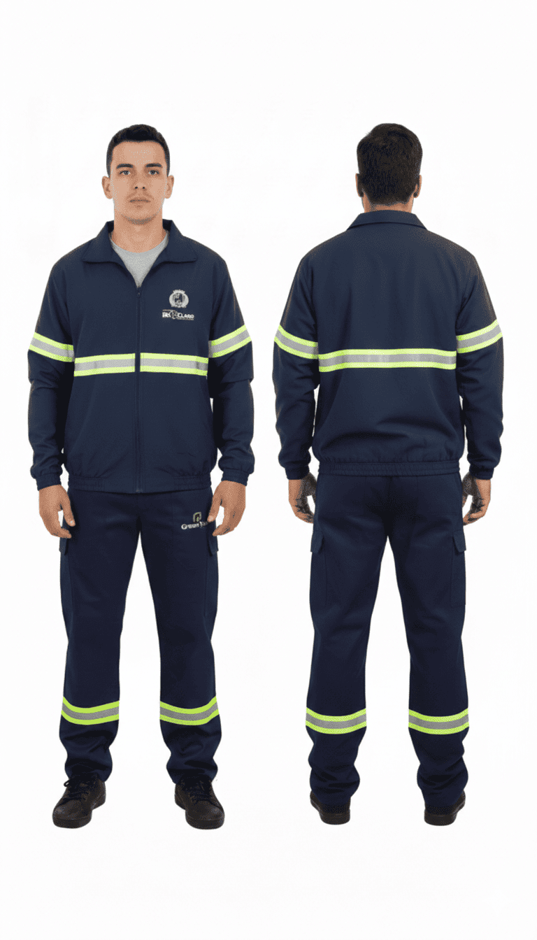 Recomendamos o brim pesado ou gabardine 100% poliéster. São materiais de alta gramatura que oferecem máxima durabilidade contra o desgaste diário, sendo ideais para o setor industrial e de serviços pesados que exige uniformes profissionais resistentes.